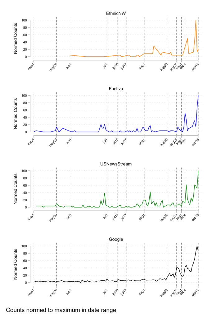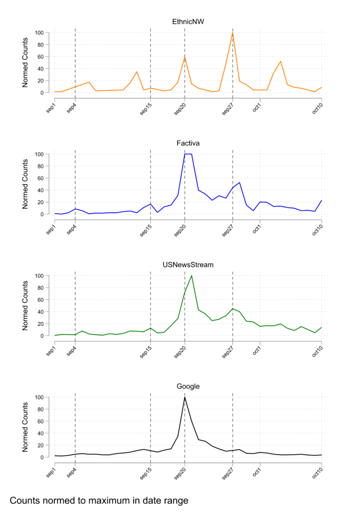 First, we look at the close-up of coverage and trends in the 40 days around the big protest. The plots in these graphs have been normalized so that the maximum within the time period is set to 100. From top to bottom, the plots are Ethnic NewsWatch, a data source that covers Black newspapers, Factiva, a source that includes international sources and transcripts of television shows, US NewsStream, a source focused on regional and national US news sources, and Google Trends search for the keyword “Jena.” See previous posts for methodological details about each of these searches. What these graphs show: (1) Generally similar patterns of Factiva, US NewsStream, and Google Trends before September 20; (2) Ethnic NewsWatch shows weekly cycles due to weekly publication, has a greater proportion of prospective coverage a week before the rally, peaks a week after the rally, and has more covering continuing into October; (3) Google Trends searching declines more rapidly after September 20 than the mainstream news sources (Factiva, US NewsStream).