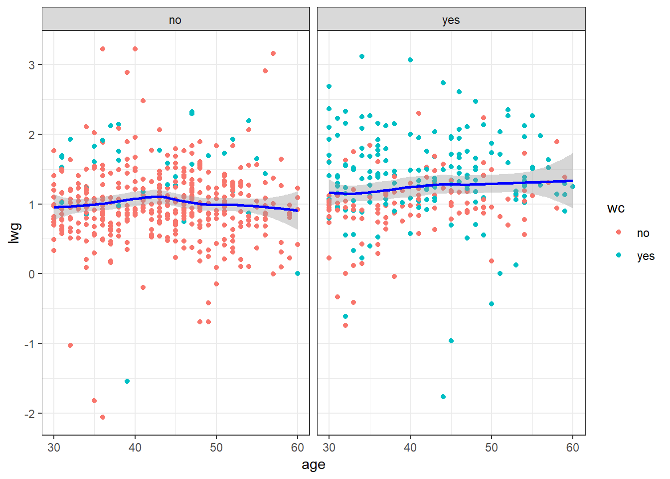 hc.ggplot(mroz, aes(x = age, y = lwg, color = wc)) + geom_point() + geom_smooth(color = "blue") + facet_wrap(~hc) + theme_bw()`geom_smooth()` using method = 'loess' and formula 'y ~ x'