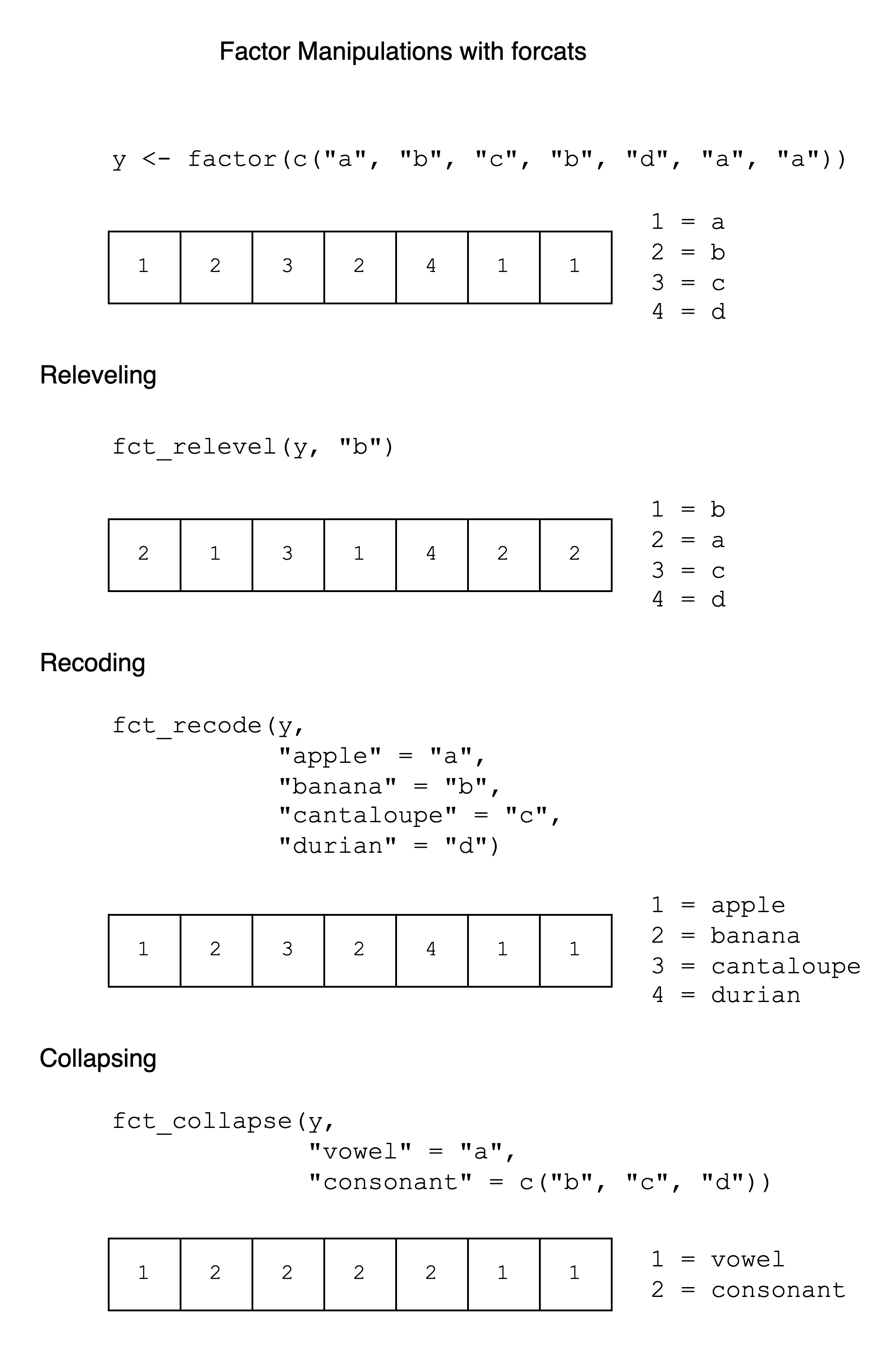 The label “a” is the first level, “b” the second, “c” the third, and “d” the fourth. Factor levels are ordered alphabetically by default. We could make a key as follows: