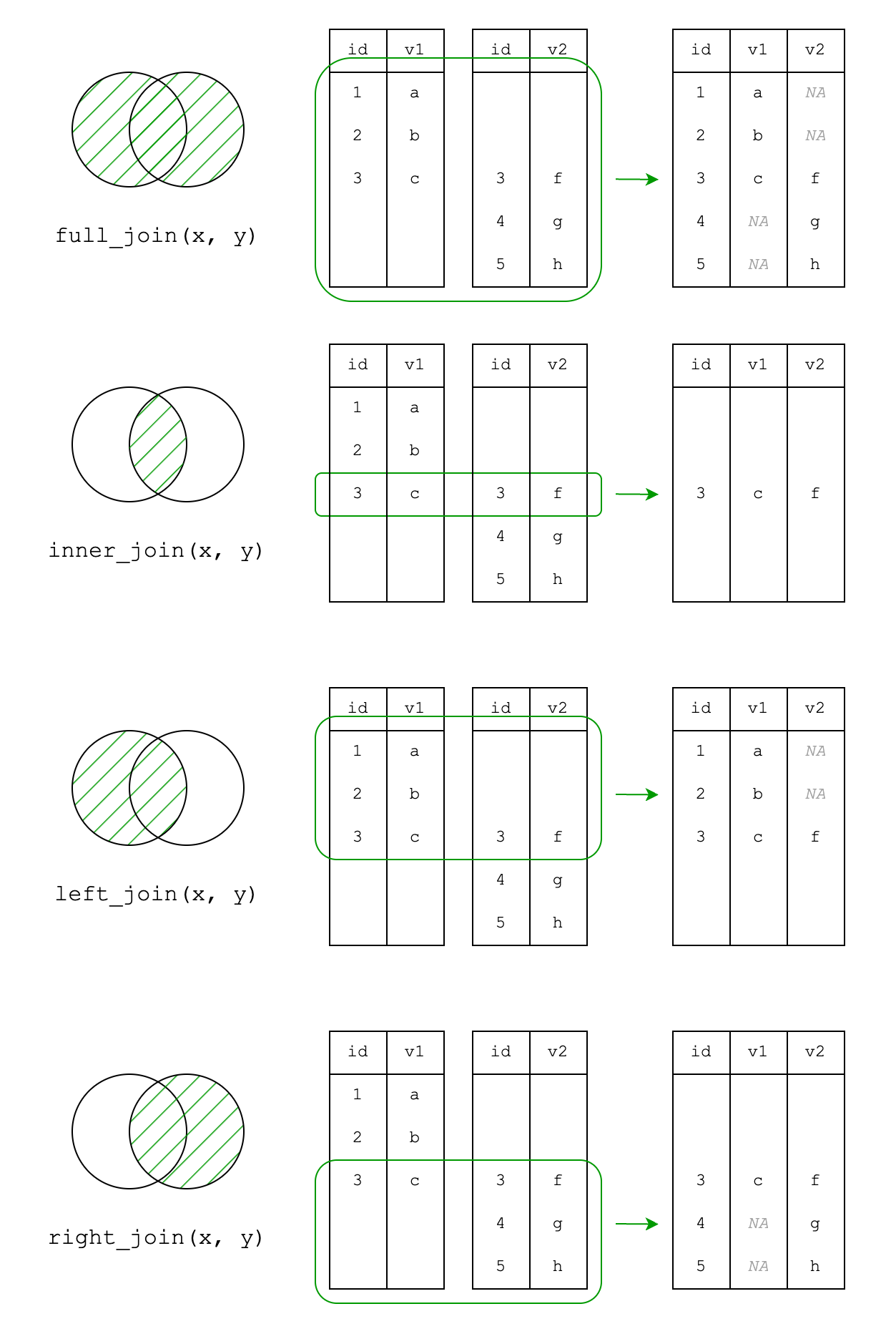 A use case for these functions is when combining two datasets that differ in their scope. You may have one dataset with information about Wisconsin schools that has a variable with the county each school is in. You then download a dataset from the Census with county-level characteristics for every county in the United States. In merging these, you would use a left or right join to only keep counties in Wisconsin since you do not need counties from other states.