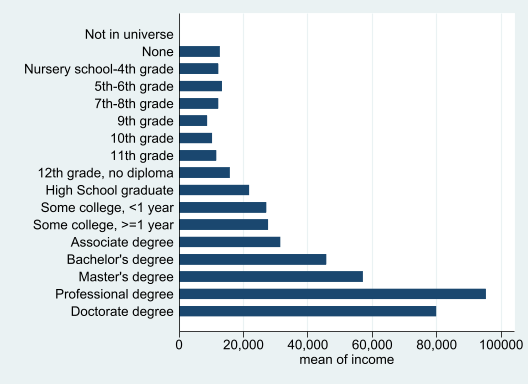 So they’re all adults, but there are no other obvious patterns. One plausible explanation is that these people had losses on investments. However, in order to lose money on investments you have to have investments. So if that’s the explanation, these people may have substantial wealth even though they have negative incomes in this particular year. This is problematic if you plan to use income as a proxy for broader socio-economic status. You might consider changing negative values of income to missing.