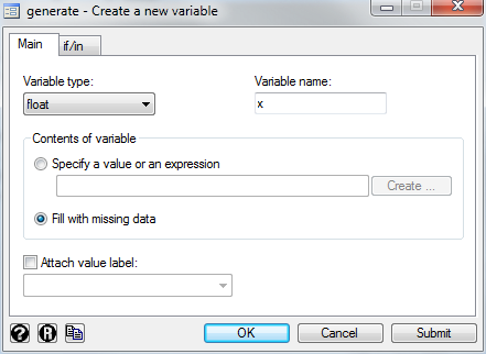 You can also create the exact same variables by typing the generate command (abbreviated gen). This could be substantially faster than the menus if you have many variables to create. The syntax is simply gen, then the variable type if it's anything but float, then the variable name, and finally what to set it equal to.