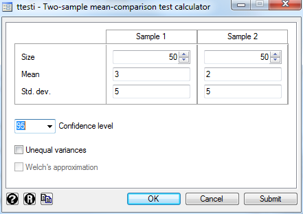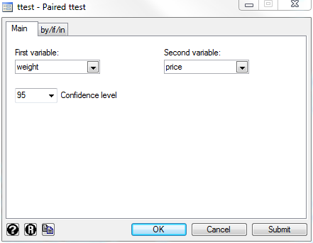 If the data are not paired (i.e. any value of price could go with any value of weight--clearly not the case in these data the price and weight for a given observation describe the same car) you'd click on Two-sample mean-comparison test instead. This will cause Stata to use a different formula but the process of setting it up is the same.