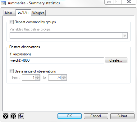 Variable lists, if conditions, by groups and options work for summarize just like they did for list in the examples in part one. You've already seen a variable list in action (getting summary statistics for mpg or rep78 rather than all variables). Next, find the mean of mpg for cars weighing over 4,000 pounds by clicking by/if/in and typing weight>4000 in the If box.