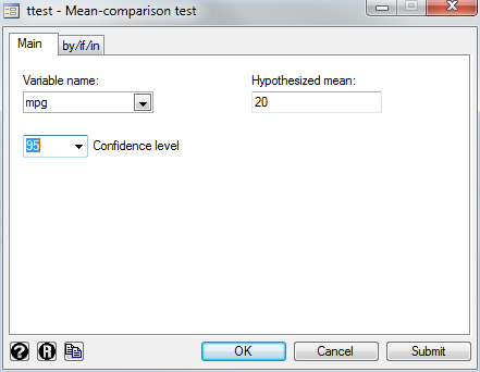 To use a t-test to test the hypothesis that the mean of a variable is equal to some number, click Statistics, then Summaries, tables, and tests, then Classical tests of hypotheses and finally One-sample mean-comparison test. Select or type mpg as the Variable name and then type 20 in Hypothesized mean. Click OK and Stata will test the hypothesis that the mean of mpg is 20.