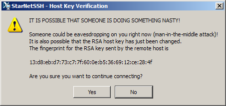 You can ignore this message and click Yes to continue connecting. Other client programs may ask you if you want to accept and save the new key. You should only get such a warning message once.